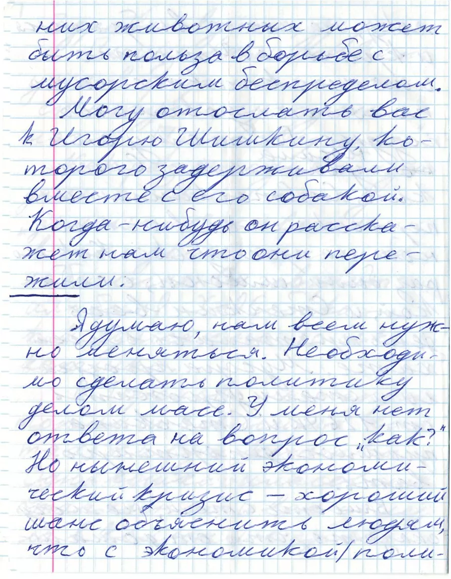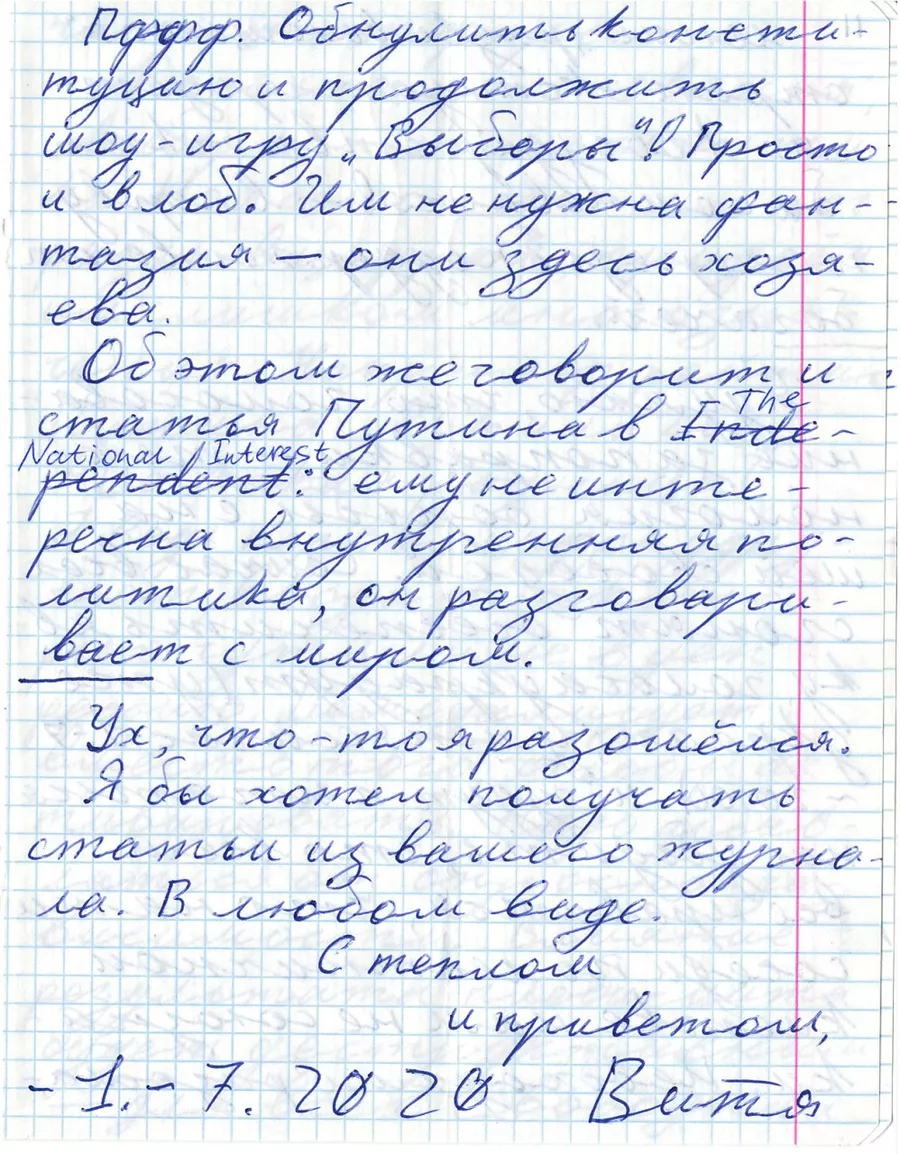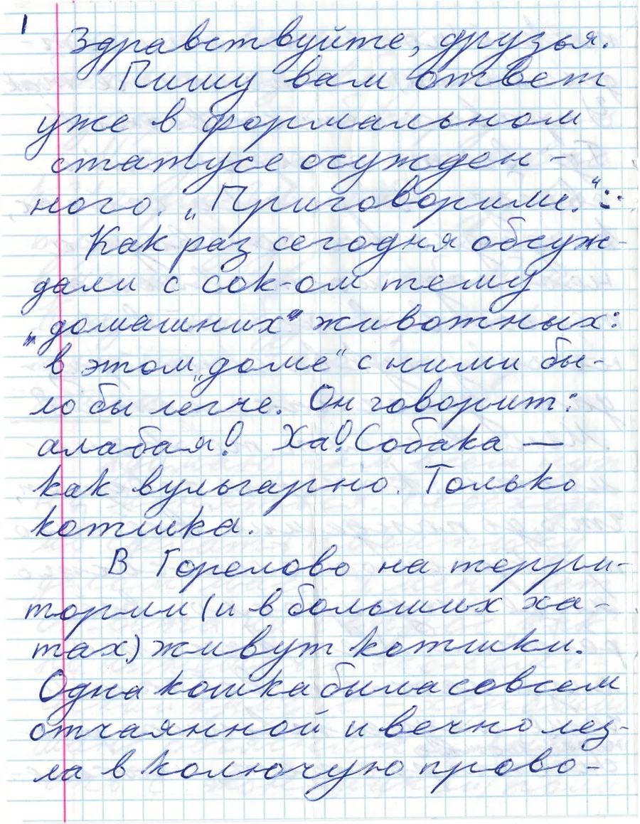 Мы считаем это дело политическим, а разбирательство — несправедливым. В мае, когда Филинков ещё только ожидал приговора, редакция Дискурса написала ему письмо со словами поддержки. Из-за пандемии письмо шло долго, Виктор прочитал его уже в статусе осуждённого. Недавно мы получили его ответ, который он написал 1 июля, в последний день голосования по поправкам в Конституцию. В своём письме Филинков делится размышлениями о ревизионизме Путина, феминизме и кошках за колючей проволокой, а также рассказывает, как домашние животные могут помочь в борьбе с полицейским беспределом и почему о сегодняшнем политическом и экономическом кризисе стоит активнее говорить вслух.