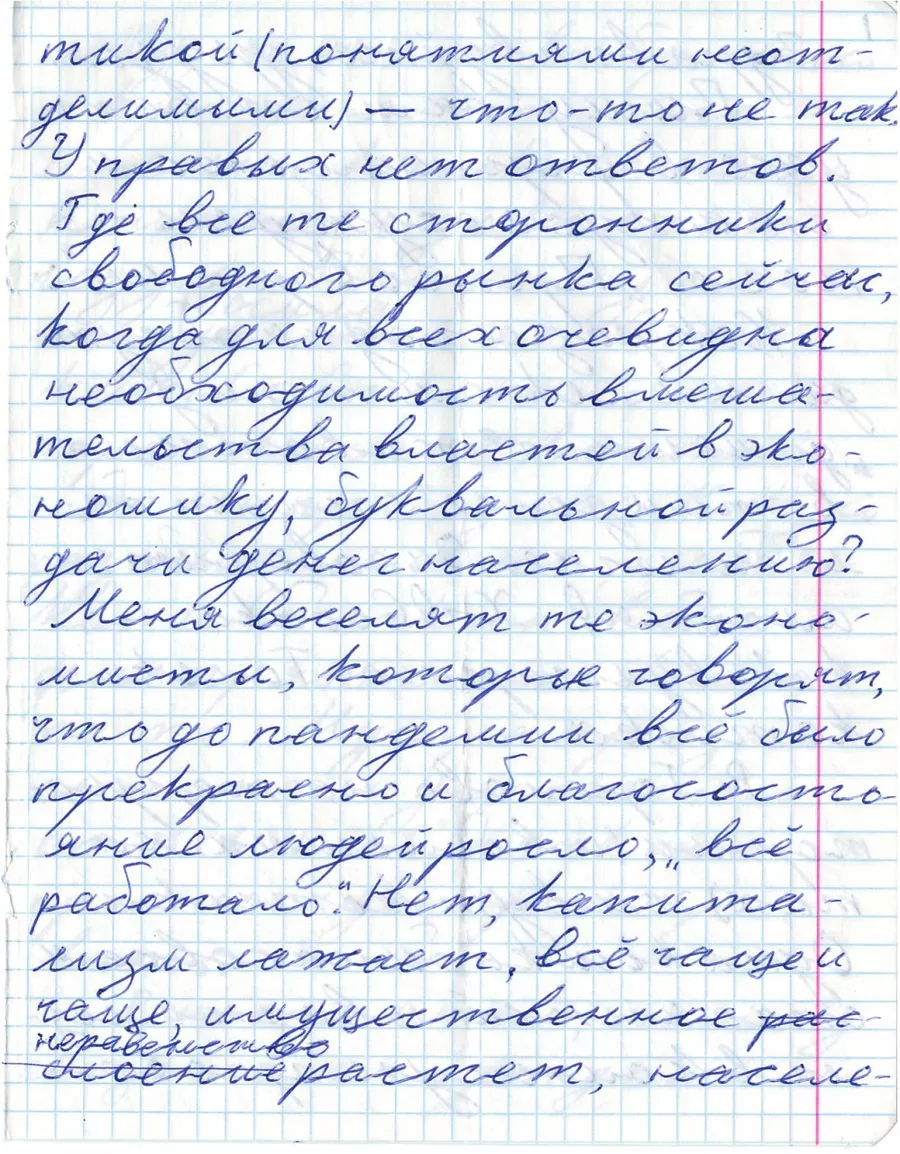 Я думаю, нам всем нужно меняться. Необходимо сделать политику делом масс. У меня нет ответа на вопрос «Как?». Но нынешний экономический кризис — хороший шанс объяснить людям, что с экономикой/политикой (понятиями неотделимыми) — что-то не так. У правых нет ответов. Где все те сторонники свободного рынка сейчас, когда для всех очевидна необходимость вмешательства властей в экономику, буквальной раздачи денег населению? Меня веселят те экономисты, которые говорят, что до пандемии всё было прекрасно и благосостояние людей росло, «все работало». Нет, капитализм лажает всё чаще и чаще, имущественное неравенство растёт, население «развивающихся» стран эксплуатируется. А государства — кто бы сомневался! — в первую очередь поддерживают богачей.