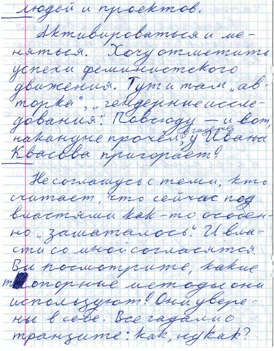 Активироваться и меняться. Хочу отметить успех и феминистского движения. Тут и там «авторка», «гендерные исследования». Повсюду — и вот накануне прочел в [Новой] газете у Ивана Квасова пригорает !
