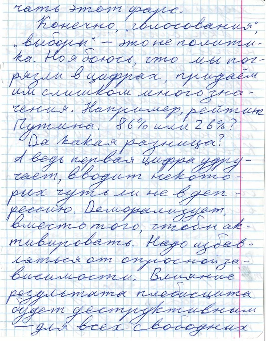 Конечно, «голосования», «выборы» — это не политика. Но я боюсь, что мы погрязли в цифрах, придаём им слишком много значения. Например, рейтинг Путина. 86% или 26%?