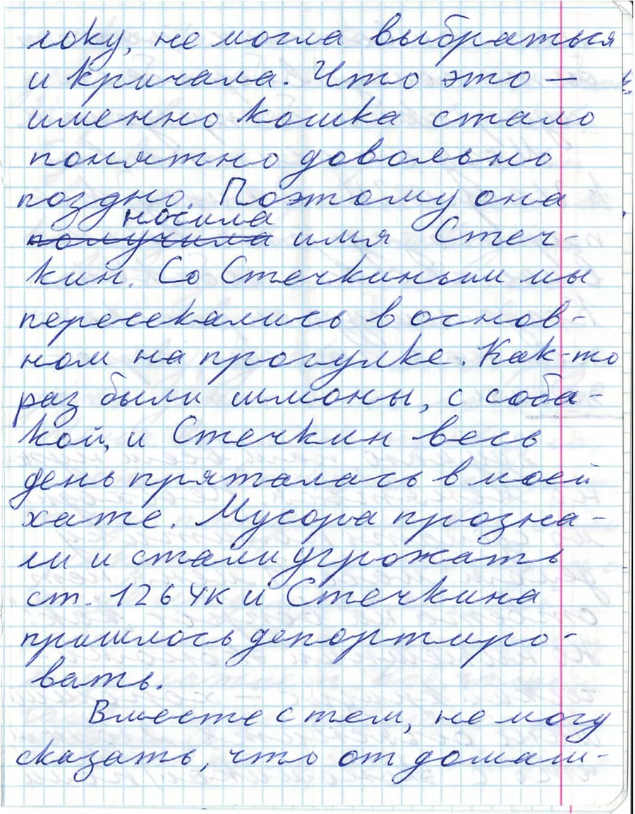 В Горелово на территории (и в больших хатах) живут котики. Одна кошка была совсем отчаянной и вечно лезла в колючую проволоку, не могла выбраться и кричала. Что это — именно кошка [а не кот] стало понятно довольно поздно. Поэтому она носила имя Стечкин. Со Стечкиным мы пересекались в основном на прогулке. Как-то раз были шмоны, с собакой, и Стечкин весь день пряталась в моей хате. Мусора прознали и стали угрожать ст. 126 УК и Стечкина пришлось депортировать.