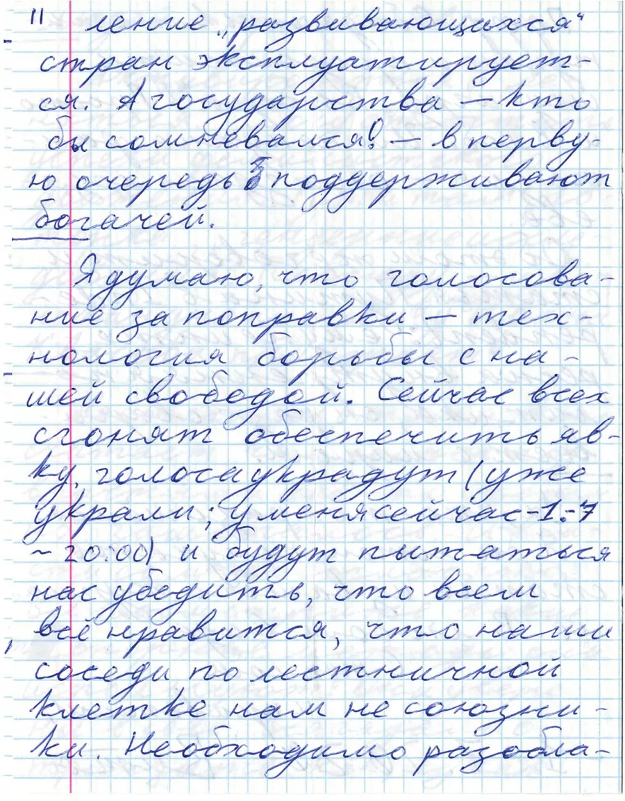 Я думаю, что голосование за поправки — технология борьбы с нашей свободой. Сейчас всех сгонят обеспечить явку, голоса украдут (уже украли, у меня сейчас 1 июля, [время] 20:00) и будут пытаться нас убедить, что всем всё нравится, что наши соседи по лестничной клетке нам не союзники. Необходимо разоблачать этот фарс.