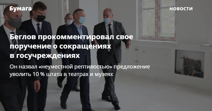 Как писала «Бумага», комитет по культуре разослал руководителям подведомственных учреждений письмо с просьбой до 24 июля предоставить предложения о сокращении 10 % штатов. Беглов заявил, что «некоторые чиновники проявили неуместную ретивость и выпустили скороспелый, непродуманный документ, который вместо конструктивного настроя создает панические настроения».