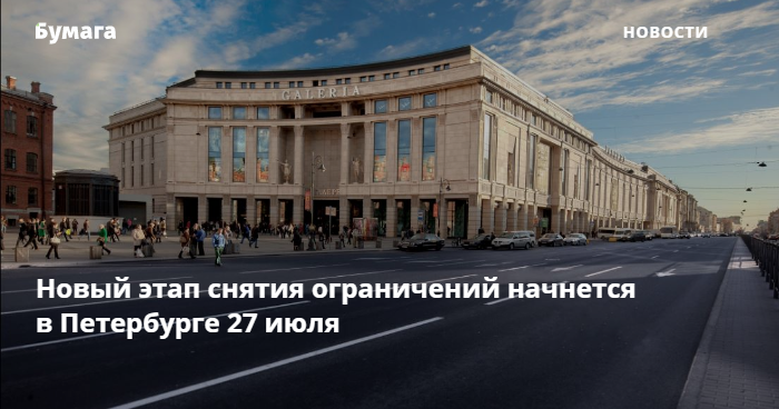 Ранее губернатор Петербурга Александр Беглов поручил вице-губернаторам Евгению Елину и Олегу Эргашеву согласовать открытие торговых центров и ресторанов Петербурга именно 27 июля. Сейчас ТЦ в городе закрыты, попасть можно только в отдельные магазины, если у них есть свой вход с улицы.