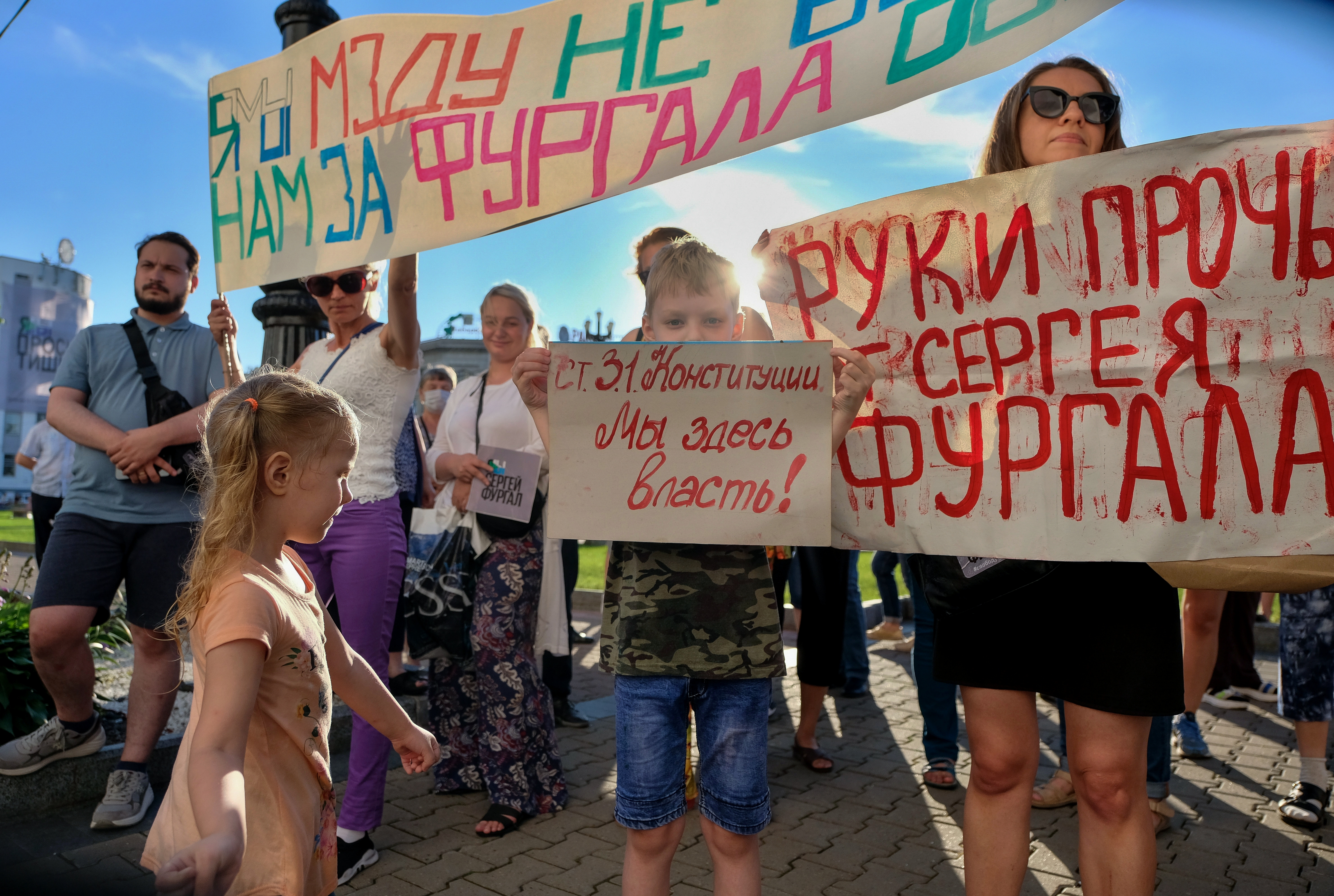 - После задержания избранного губернатора края Сергея Фургала в Хабаровском крае и соседних регионах несколько дней проходят митинги и пикеты. Чаще всего митингующие требуют для губернатора "справедливого суда в регионе". 22 июля они потребовали отставки президента России Владимира Путина.