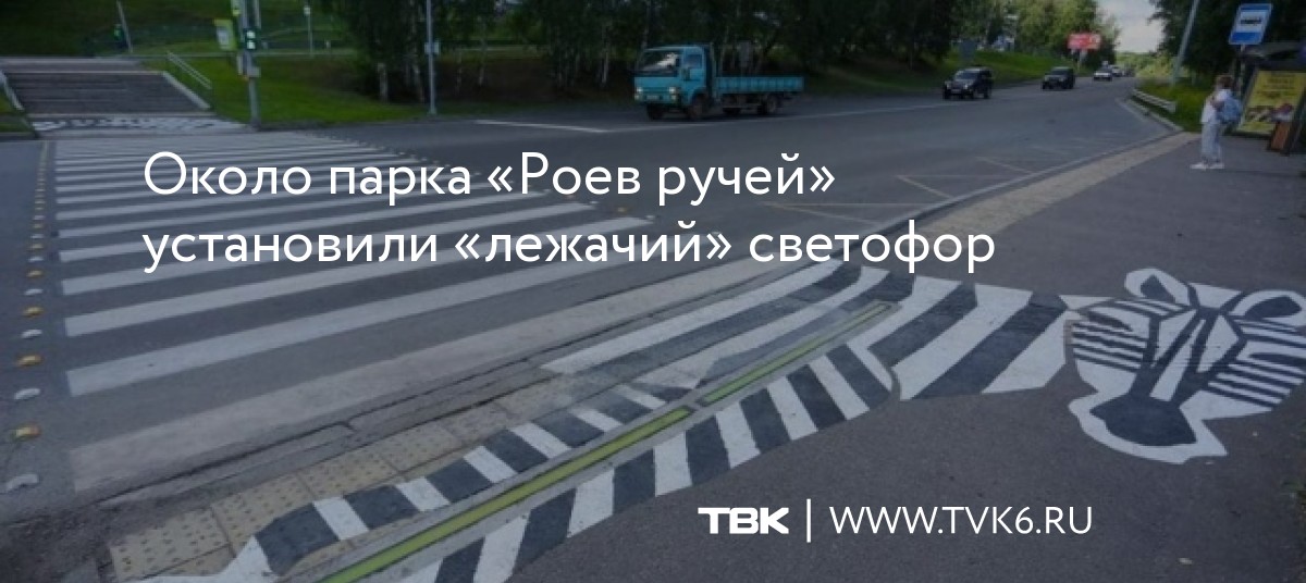 На пешеходном переходе у парка «Роев ручей» установили «лежачий» светофор – на стыке тротуара и проезжей части сделали светодиодные фонари, которые дублируют сигналы светофора. Переход обновили для увеличения безопасности этого участка дороги – светодиодные подсветки должны привлечь внимание пешеходов, смотрящих в экран телефона, и детей.