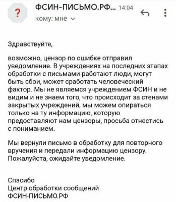 сообщаетсяОтправителям писем приходит уведомление о том, что Воронцов получил письмо, но ответа от арестованного не следует. Из-за этого администраторы телеграм-канала сделали вывод, что Воронцову не доходят письма людей, «с кем он был в товарищеских отношениях».