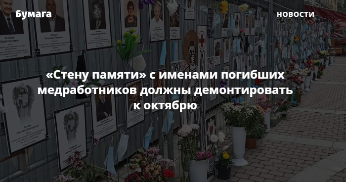 «Стену памяти» с именами погибших во время пандемии медработников, которая располагается на строительном заборе на Малой Садовой, должны демонтировать к октябрю. Об этом «Бумаге» рассказала создательница неофициального мемориала Ирина Маслова.