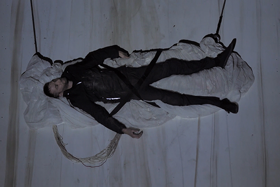 © ПРОВМЫЗА ПРОВМЫЗА. Oratorium SARX SOMA Неспешно, тщательно художники развертывают видеофреску на тему ритуала прощания/прощения. Стоящая в заводском цеху огромная конструкция превращается в некую отвесную переправу, принимающую или возвращающую различные тела и грузы. На подвесных крюках и штангах, на носилках и с парашютом двигаются вниз-вверх живые и мертвые тела: от скользящих по горе собак, пытающихся вскарабкаться наверх, до бутафорской потрепанной лошади и спрессованных автомобилей, в воздухе на тросах исполняющих завораживающий траурный вальс. В начале фильма в кучу золы или угля кидаются блестящие металлические предметы. Если прочитать текст Арто, то можно понять, что это подковы, ошейники, а также конская и собачья упряжь. Ее описывает Арто в рассказе о молниеносном и деморализующем действии чумы, вспоминая, как в Ассирии в библейские времена полчища крыс напали на войско и сожрали всю конскую упряжь.