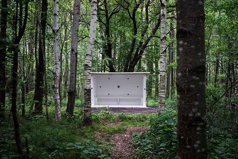 Немотивированное чувство, воздействующее сильнее, нежели чувство реальное, ожидает посетителя заброшенного садоводческого товарищества, которое находится на проселочной дороге в 50 км от Нижнего Новгорода. Все домики и поля стали настоящим царством энтропии. Постройки ветшают, чернеют и превращаются в уникальные руины, сквозь которые прорастают кусты и цветы. Эту мастерскую выбрал для своего искусства Владимир Чернышев. У него своя метафизика распада/собирания. В чем-то она согласуется с романтическим представлением о руинах как вдохновенных проводниках сознания и чувств к совершенству Бытия через утрату, скол, фрагмент. Домыслить, пробудить воображение в сопротивлении разрушительному потоку времени — вот суть философии руины. Лучше всего руина прижилась в садово-парковом искусстве. В своем заброшенном саду Чернышев создает что-то вроде мистического поместья с обелисками, хижинами, павильонами, тайными письменами, собственной мифологией. Пришла пора выстроить храм философского размышления о пути. Форма украшенной звездами автобусной остановки в лесной чаще выбрана очень кстати. Если идти по заброшенной дороге, то можно выстроить ось от остановки Чернышева до реальной остановки проселочного автобуса, везущего в суетный мир. На остановке Чернышева почти никогда никого нет. Посетители поместья художника — лишь лоси и лисы. Любая транспортная остановка вводит в контекст социальных связей. Но в случае с Чернышевым это социализация нечеловеческого пространства. Бесконечно редуцируемое телесное присутствие.