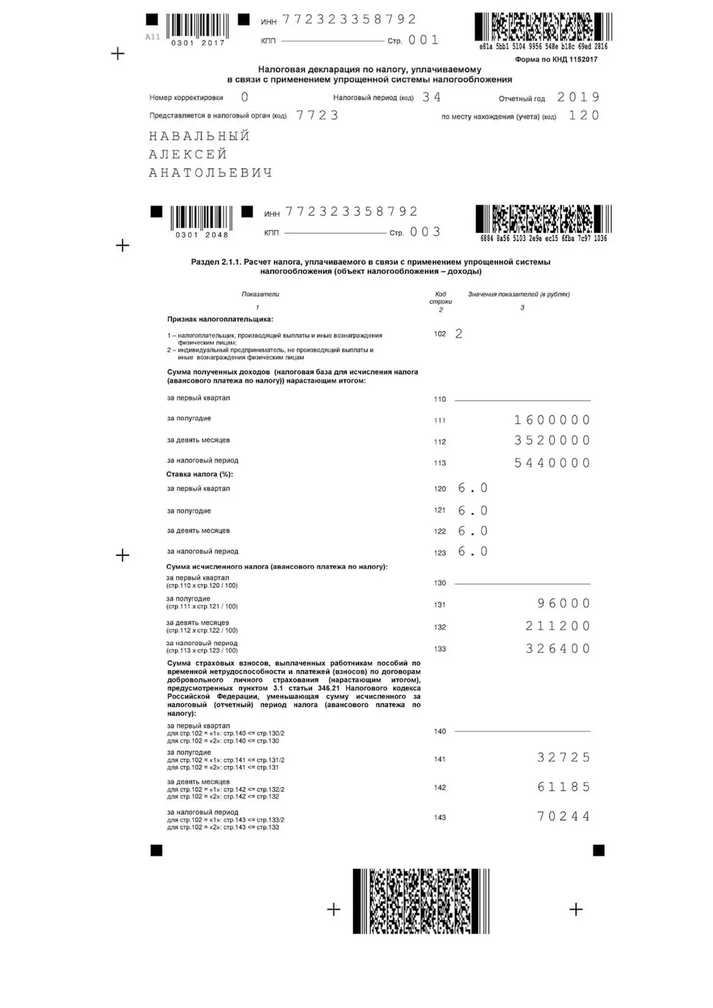 За 2019 год доход Навального составил 5 440 000 рублей, в среднем это 453 тысячи рублей в месяц. За прошлый год Навальный выплатил в качестве налогов 326 400 рублей.