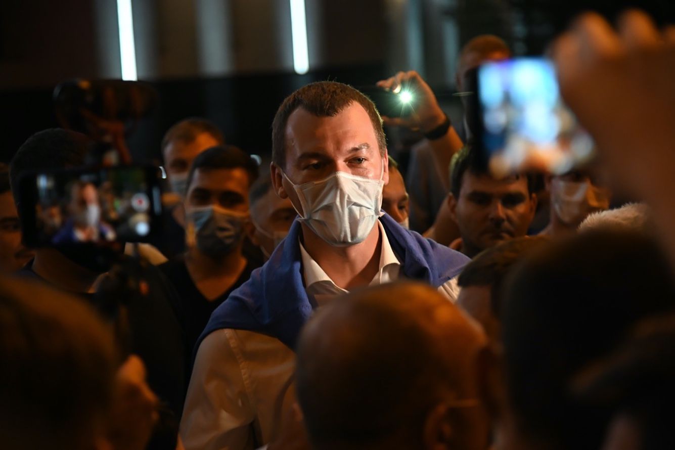 Площадь Ленина — то место, где вот уже вторую неделю подряд начинаются все митинги и шествия. Впрочем, на часах было уже больше десяти вечера — а митинговать хабаровчане заканчивают ровно в десять, так что участников протестов на площади почти не осталось. Через несколько минут перед зданием остановился кортеж, из которого вышел врио губернатора Хабаровского края Михаил Дегтярев. Вокруг него быстро начали собираться люди, через какое-то время на площади появились журналисты.