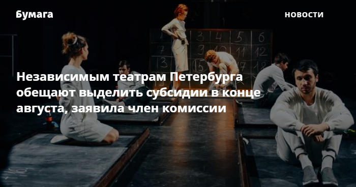 Петербургским негосударственным театрам, которые в июле не получили материальную поддержку от комитета по культуре, планируют выдать субсидии во второй половине августа 2020 года. Об этом «Бумаге» сообщила депутат Законодательного собрания Петербурга от «Единой России» Анастасия Мельникова, которая участвовала в заседании комиссии.