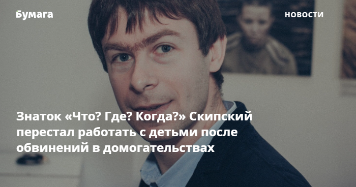 Знаток «Что? Где? Когда?» Михаил Скипский добровольно приостановил участие в комиссии Международной ассоциации клубов по работе с детьми и молодежью после обвинений в домогательствах к несовершеннолетним. Об этом сообщает «Проект» со ссылкой на президента МАК Андрея Козлова. Информация об этом также появилась на официальном сайте организации.