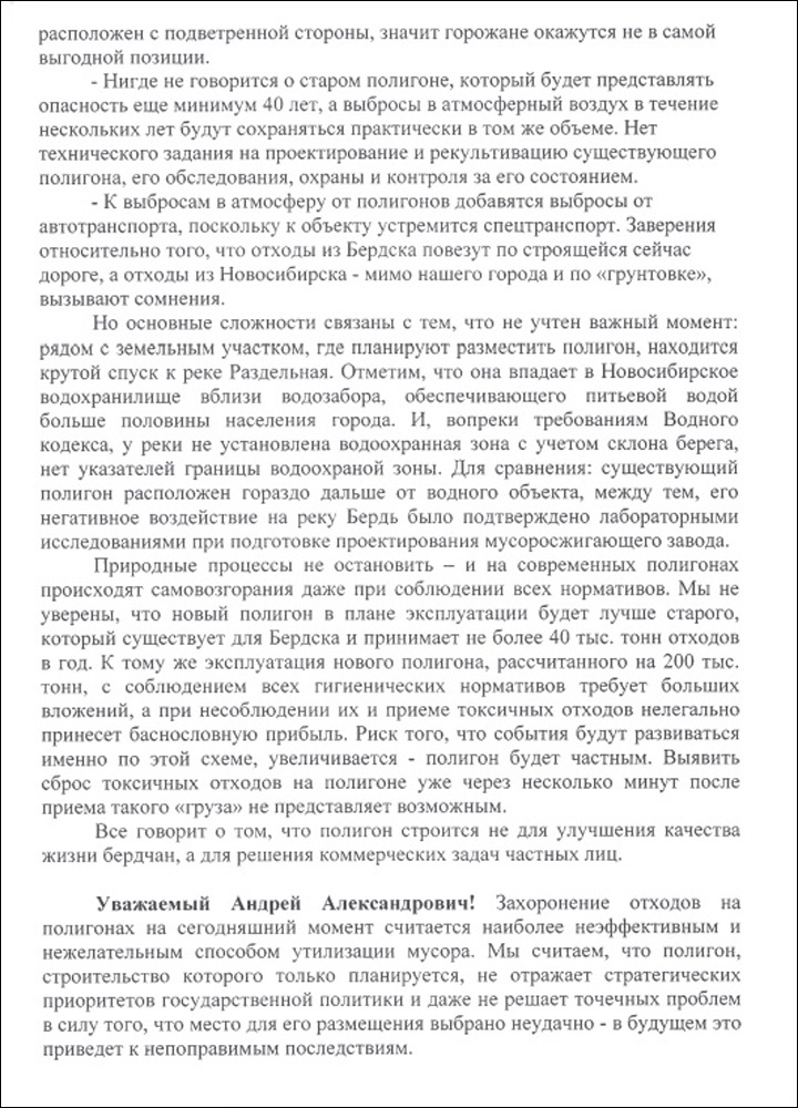 Члены рабочей группы по строительству полигона в районе поселка Маяк Искитимского районе на границе Бердска подготовили обращение к Травникову и мэру Бердска Евгению Шестернину. Копия письма оказалась в распоряжении Тайги.инфо.