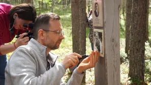 Максим Лялин устанавливает памятную табличку в Сандармохе. Фото Н. Деминой