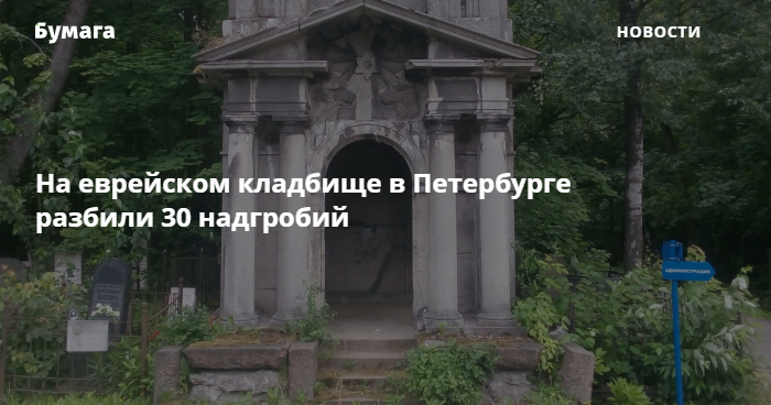 На кладбище на проспекте Александровской фермы в Невском районе повредили 30 надгробий. Об этом «Бумаге» сообщили в пресс-службе МВД по Петербургу. По данным источников 78.ru, «Форпоста» и «Фонтанки», инцидент произошел на еврейском кладбище.