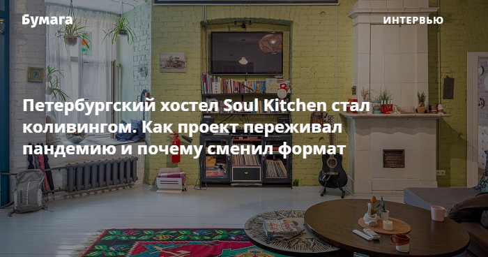 Хостел Soul Kitchen, который пять раз признавали лучшим в мире, запустил коливинг вместе с международным проектом «Станция Смена». Основатели объясняют это решение масштабным кризисом в туристической индустрии. По оценке «Лиги Хостелов», в Петербурге уже закрылось около 20 % средств размещения.