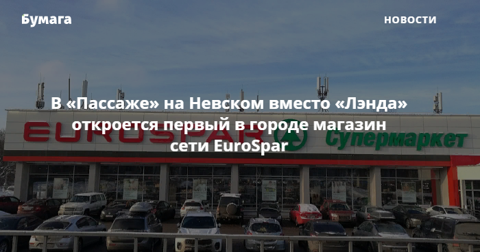 В «Пассаже» на Невском проспекте откроется первый магазин формата EuroSpar, входящий в сеть SPAR International. Об этом сообщает «РБК» со ссылкой на пресс-службу «Пассажа». Информацию также подтвердили «Фонтанке» в консалтинговом агентстве Knight Frank, которое выступает брокером сделки.