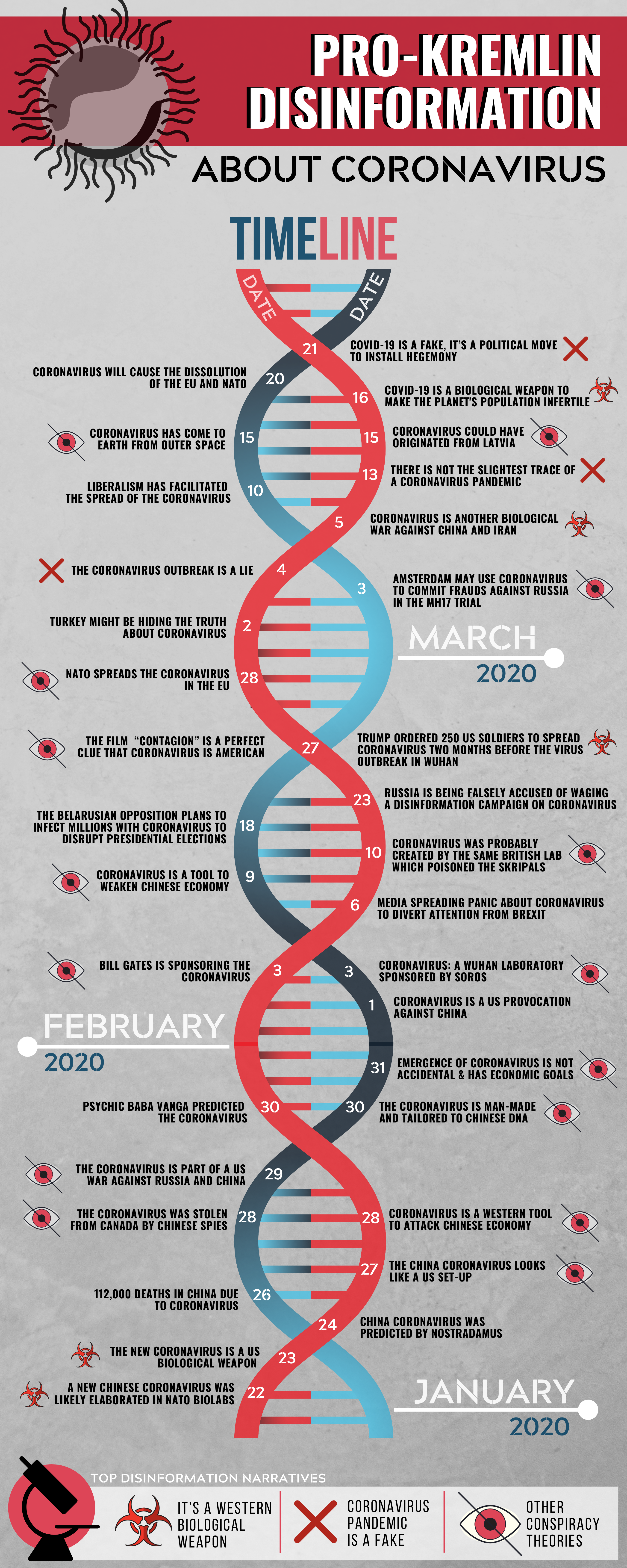 Согласно отчёту, российская военная разведка (Главное управление Генштаба, известное как ГРУ) использовала, по меньшей мере, три сайта - InfoRos.ru, Infobrics.org и OneWorld.press - где были опубликованы более чем 150 статей, в которых пропагандируются конспирологические теории, в частности, китайские утверждения о том, что коронавирус был создан в качестве биологического оружия в американской военной лаборатории. Также в них появляются, например, комментарии о том, что российское медицинское оборудование, доставленное в США, "откроет эпоху разрядки в отношениях двух стран".