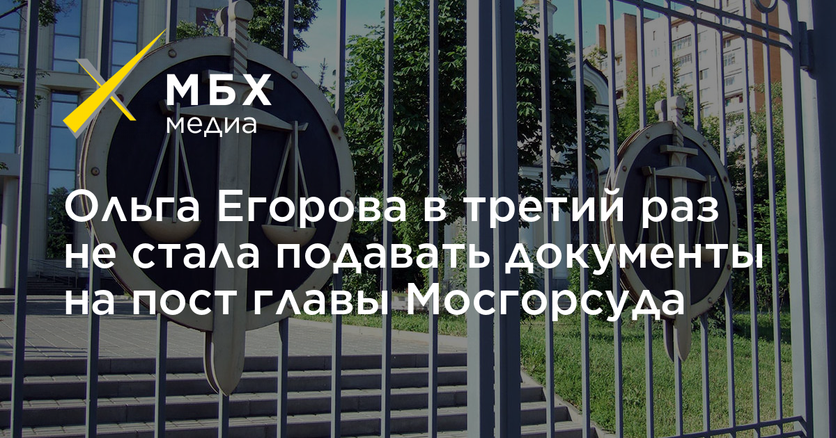 Председатель Московского городского суда Ольга Егорова уже в третий раз не подала документы на замещение вакантной должности председателя суда в новом сроке. Об этом обозревателю «МБХ медиа» Зое Световой сообщил источник в судейских кругах.