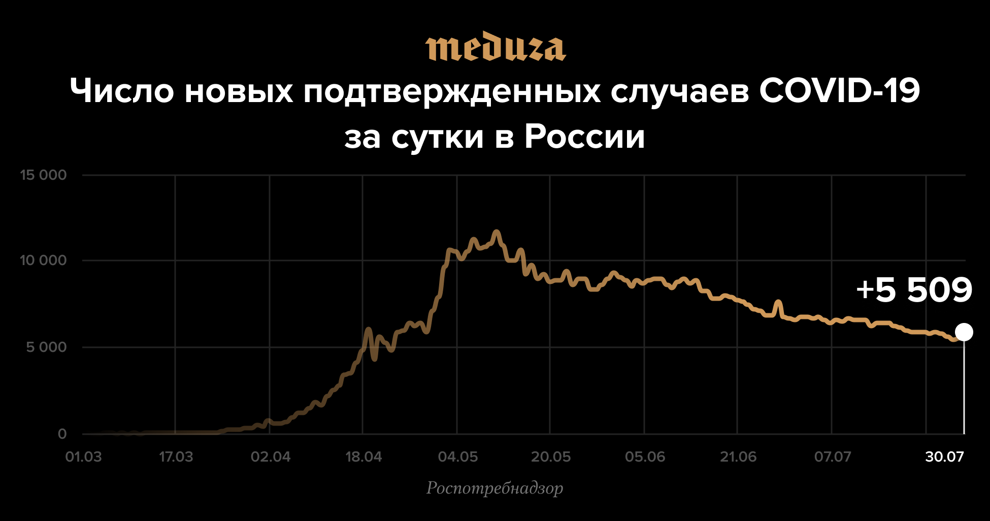 В России 11 дней подряд выявляют меньше шести тысяч новых случаев COVID-19 за сутки: сегодня было 5509 случаев. Больше всего заразившихся в Москве (+678 человек за сутки), Свердловской области (+215) и ХМАО (+172). Всего с начала пандемии в стране заболели 834 499 человек. За сутки выздоровели 9322 человека, всего — 629 655 человек. За сутки умерли 129 пациентов с ковидом, а за все время — 13 802 человека.