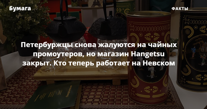 Магазин Hangetsu Tea, работников которого в 2019 году называли «чайной мафией», закрыт. Однако теперь промоутеров чаще всего видят у другой точки на Невском. А создатель Hangetsu сообщил о планах перезапустить проект.