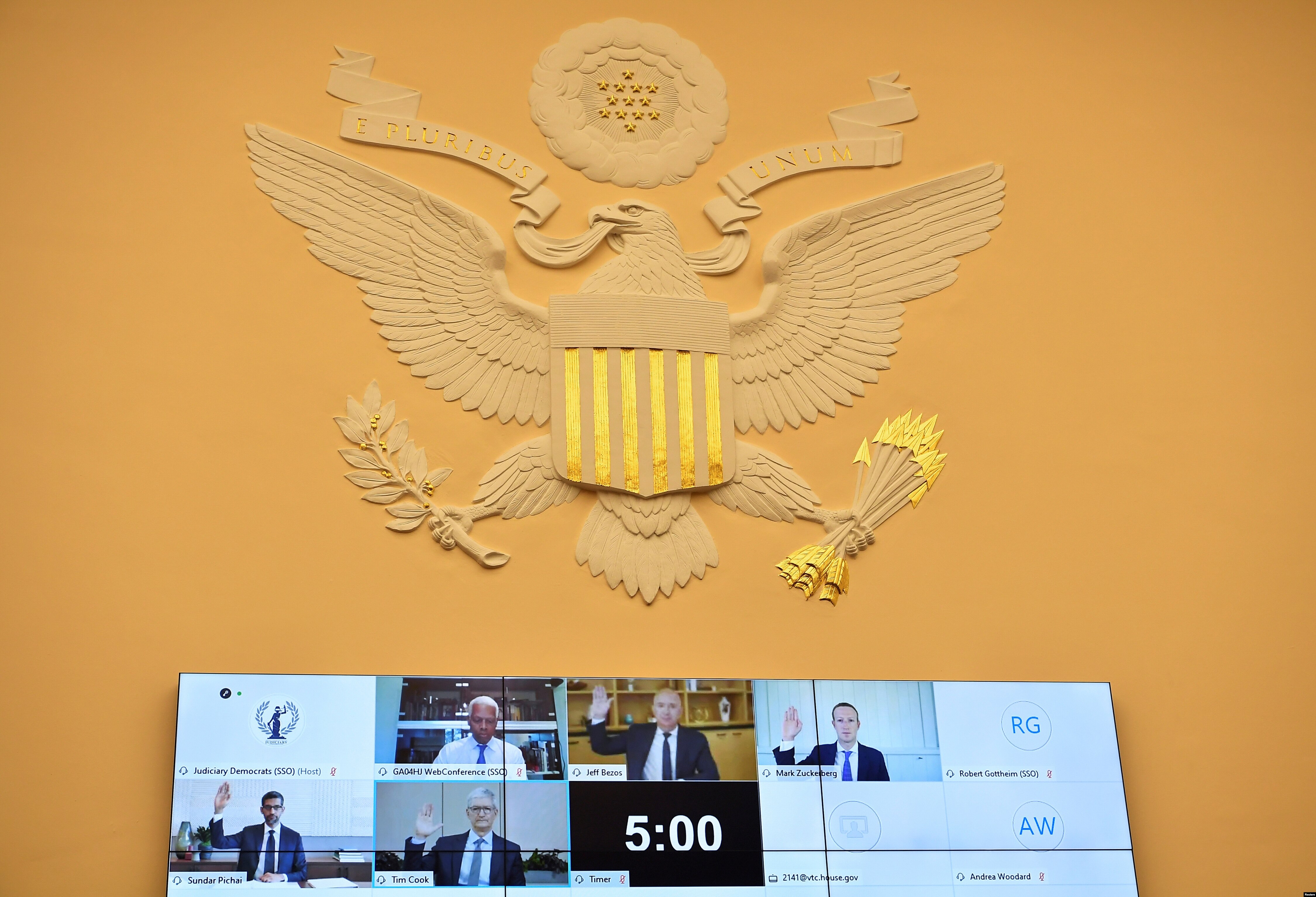 Слушания проходили в формате телеконференции. Впервые в них участвовали все 4 руководителя технологических гигантов: Сундар Пичаи (Alphabet, владелец Google), Марк Цукерберг (Facebook), Джефф Безос (Amazon) и Тим Кук (Apple).