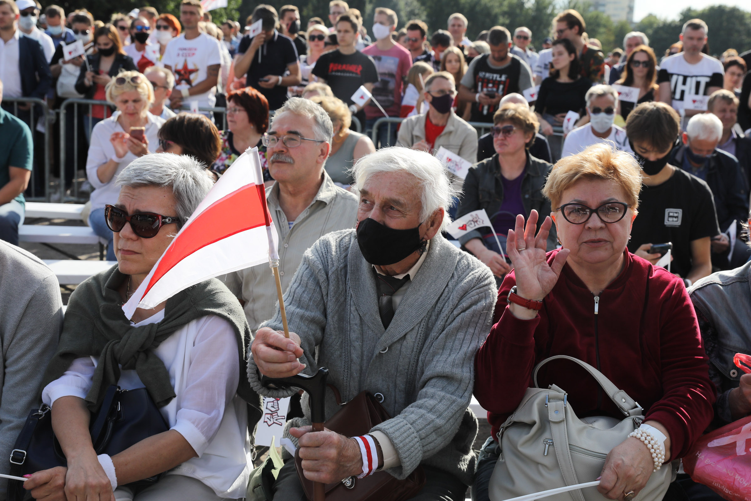 В Минске прошёл митинг-концерт в поддержку кандидата в президенты Белоруссии Светланы Тихановской. Акция была согласована с властями. По данным правозащитного центра "Весна" через пункты пропуска на митинг прошло более 60 тысяч человек. Многие держали в руках красно-белые флаги и белые воздушные шары.