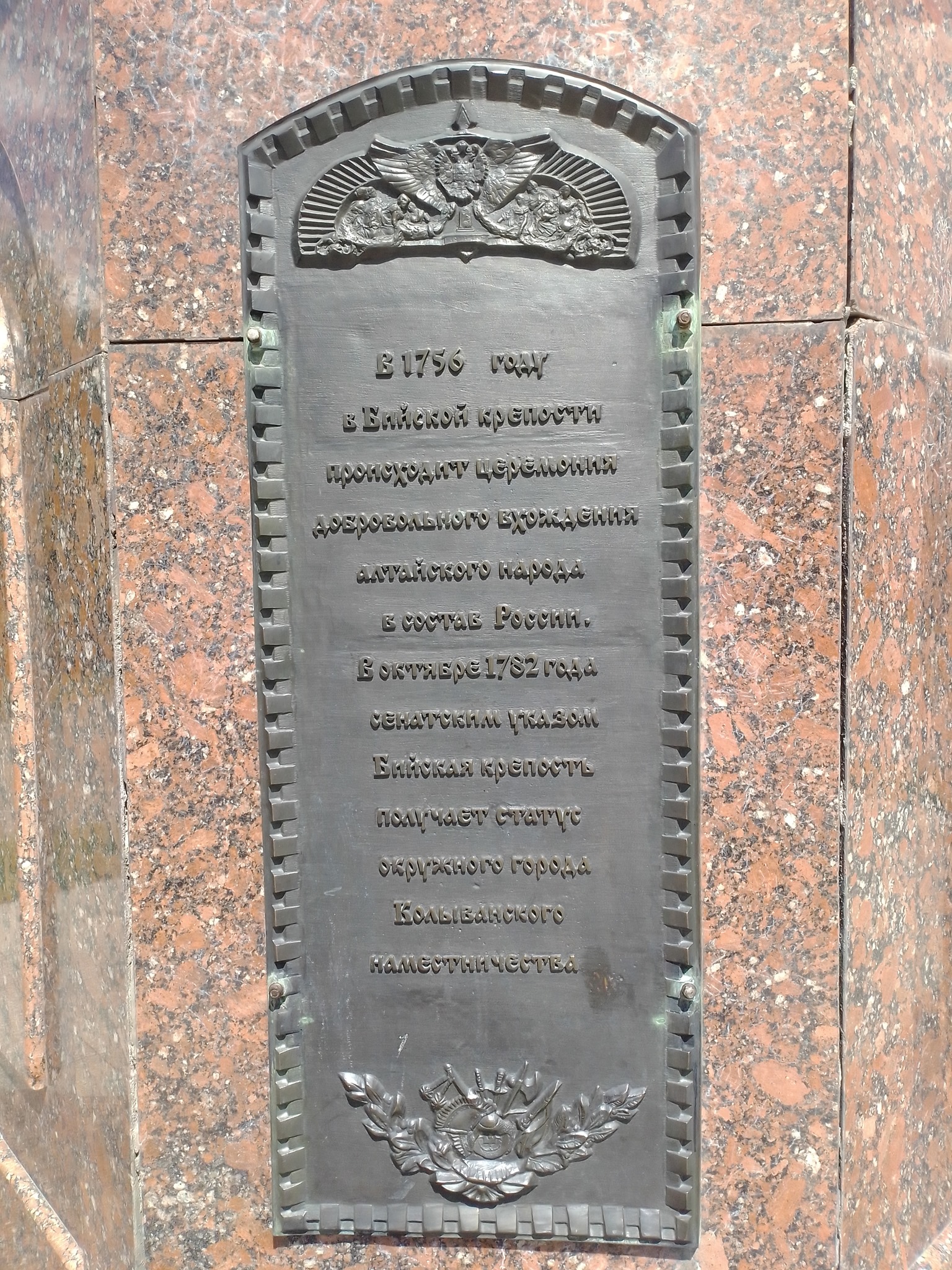 Но "добровольное вхождение" как бы искупает и оправдывает всё, все три века военной экспансии и потом внутренней колонизации Сибири. Такие надписи на памятниках указывают место, отведённое в истории Империи разным "негосударствообразующим" народам. Из ниоткуда они появляются на "церемонии добровольного вхождения" в состав Империи и навсегда исчезают в молчаливом множестве подданных. И возвышается над всеми памятник великому правителю.