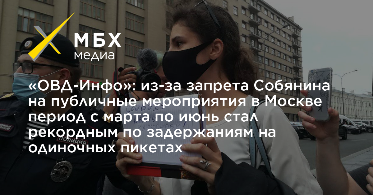 Период с марта по июнь стал рекордным по задержаниям на одиночных пикетах из-за указа мэра Москвы Сергея Собянина о запрете проведения публичных мероприятий. Об этом сообщается в аналитической записке «ОВД-Инфо». В качестве точки отсчета для исследования «ОВД-Инфо» взяло декабрь 2011 года — время создания проекта.