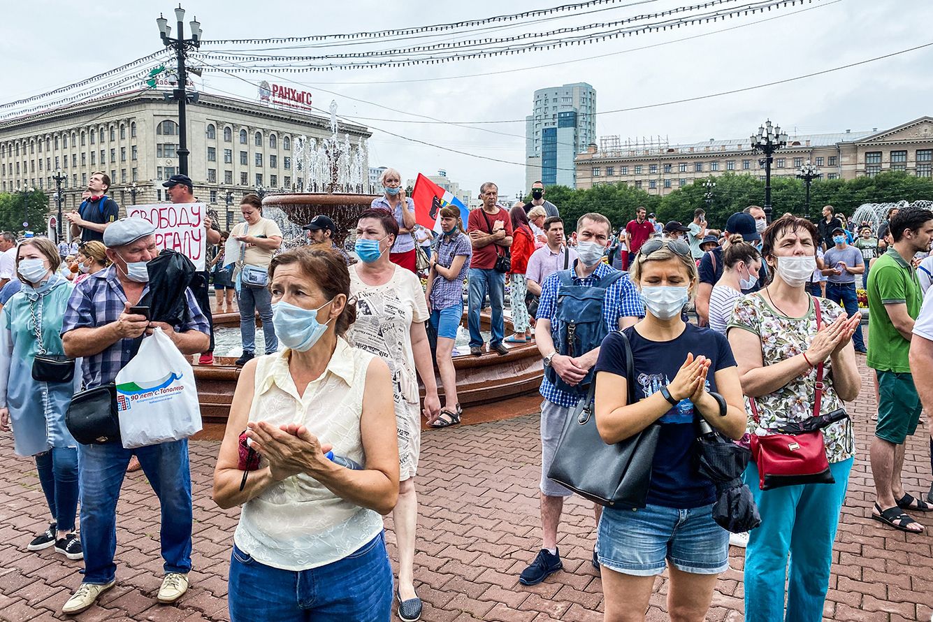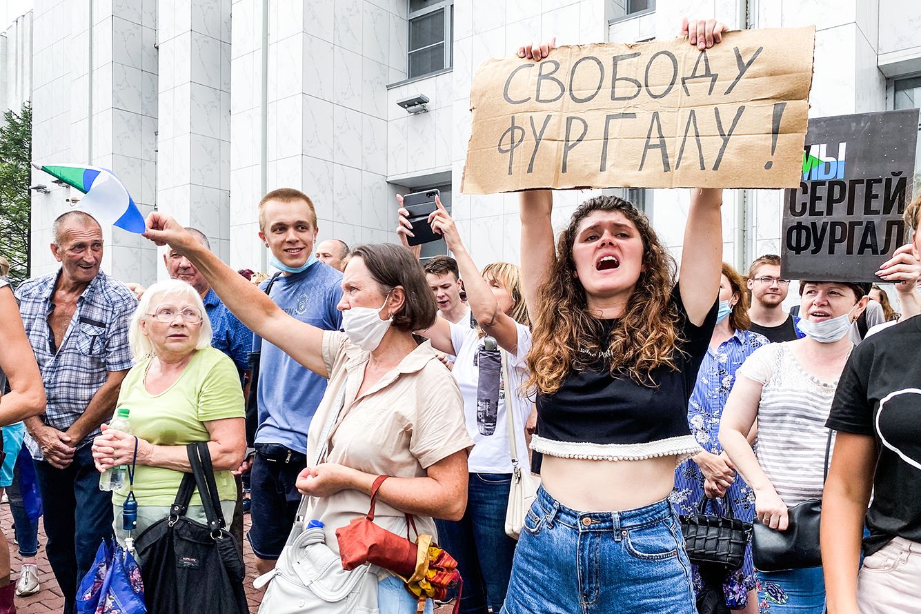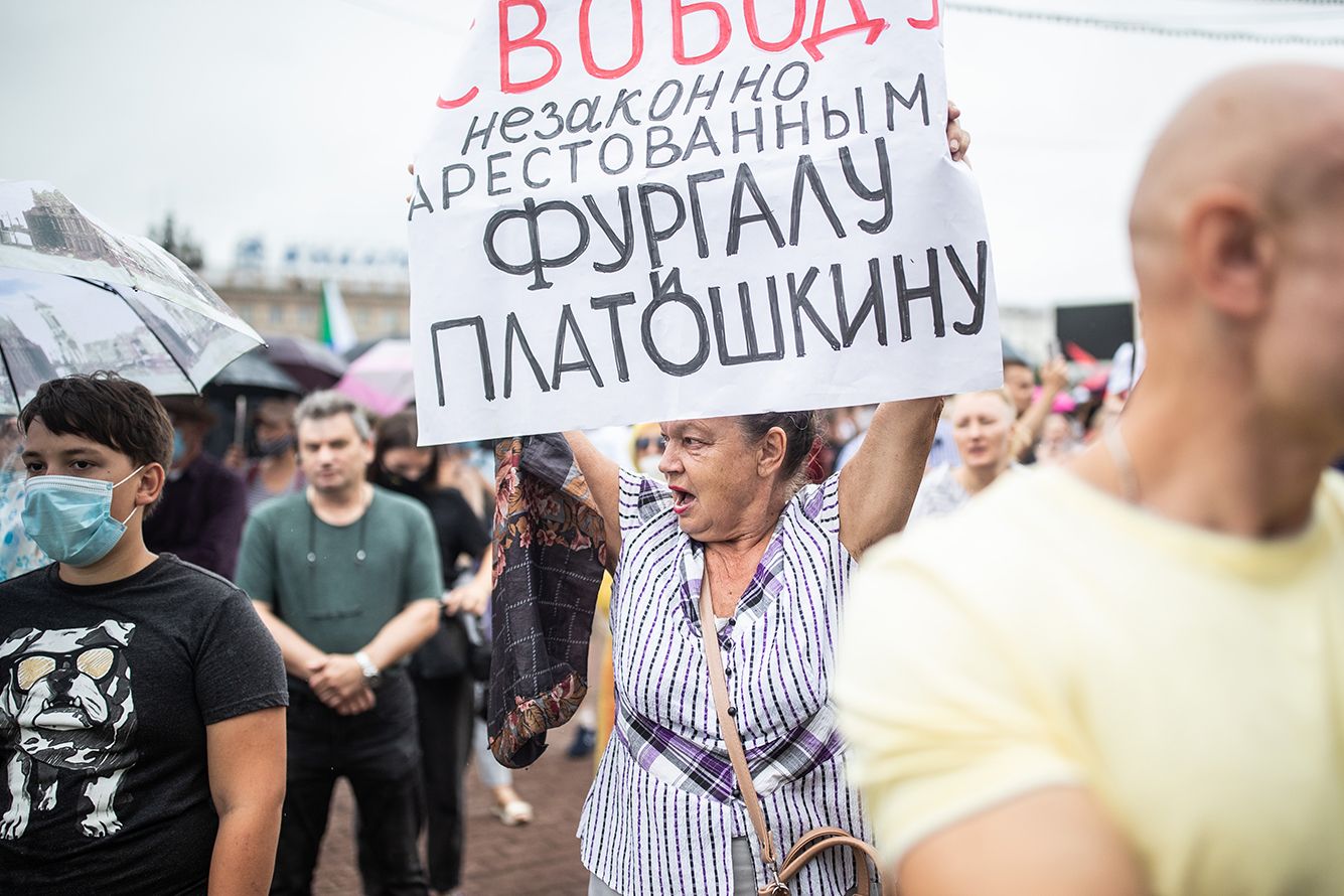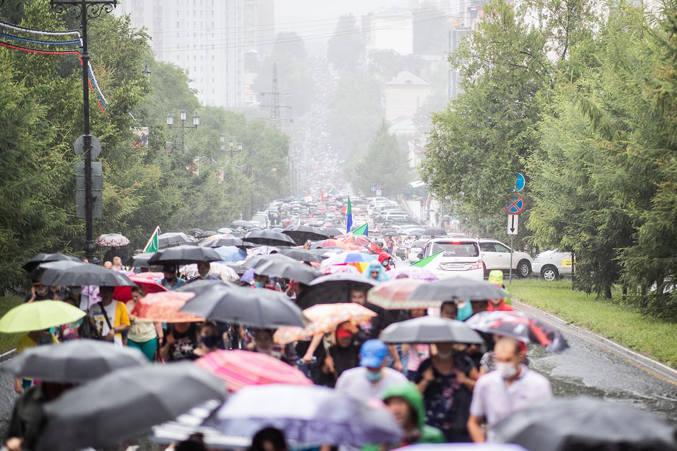 В Хабаровске 1 августа состоялась 22-я по счету акция в поддержку бывшего губернатора Сергея Фургала, обвиняемого в организации убийств. На акции, по оценке «Коммерсанта», было не меньше людей, чем неделю и две недели назад — несмотря на то что в первой половине дня в городе шел сильный дождь. Мэрия Хабаровская заявила, что на акцию вышли 3,5 тысячи человек (неделей ранее власти говорили о 6,5 тысячах участников; независимые СМИ давали оценки в 15-50 тысяч), выразив уверенность, что людей стало меньше из-за «появления на акциях поддержки представителей несистемной оппозиции и людей, которые используют площадку акции в собственных политических целях».