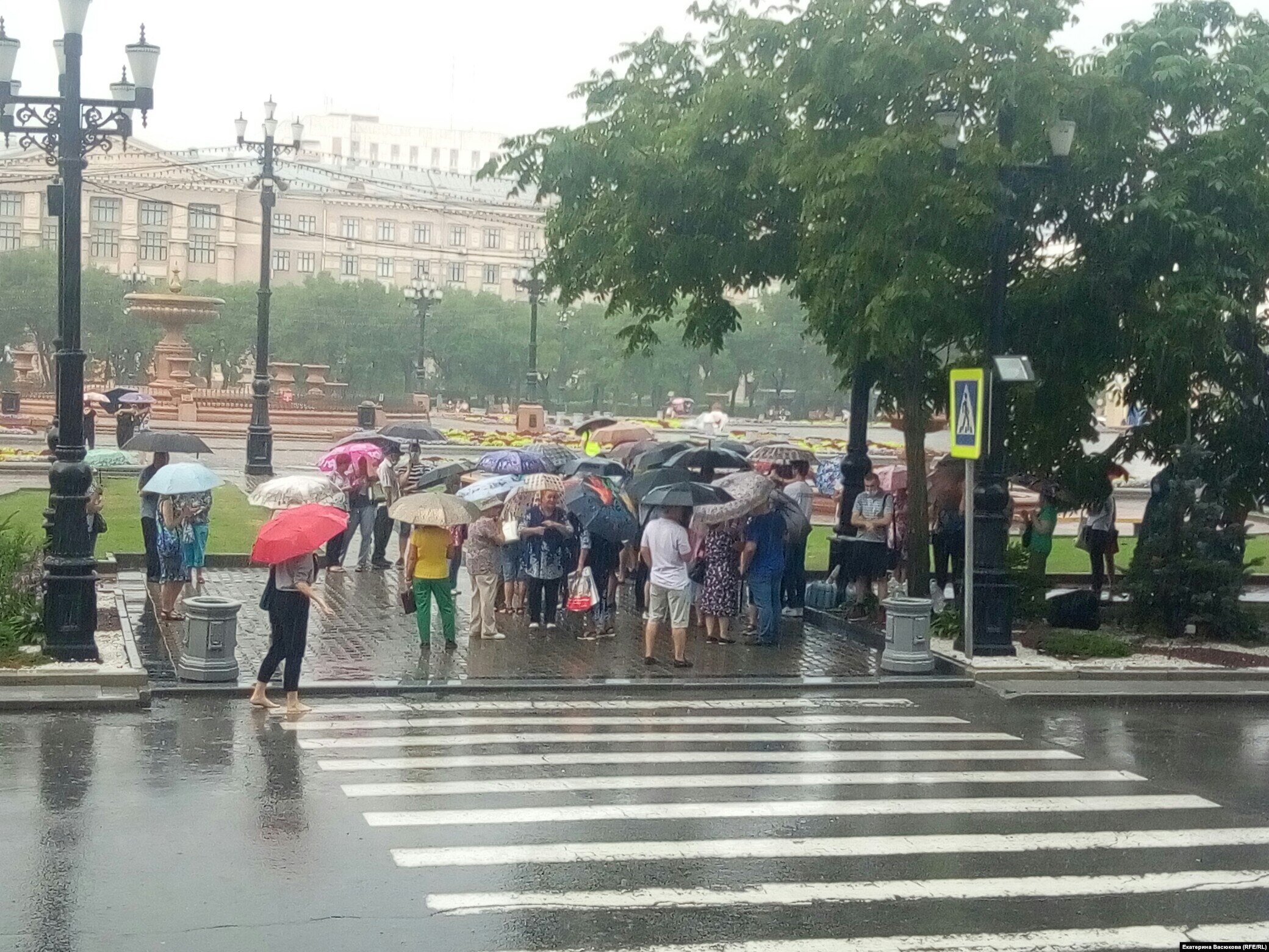 Участники начали собираться у здания правительства Хабаровского края около 12.00 по местному времени. Лозунгов сегодня практически не было. Немногочисленные протестующие только прокричали "Хабаровск выходи", как тут же начался ливень. Это горожан не остановило: подготовленные по погоде начали раскрывать зонты и надевать дождевики, остальные укрылись под деревьями и на крыльце здания правительства.