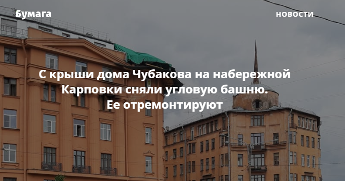 С крыши дома Чубакова на набережной Карповки, 30 снесли угловую башню. Об этом сообщили местные жители в группе «Петроградская диаспора» в фейсбуке.