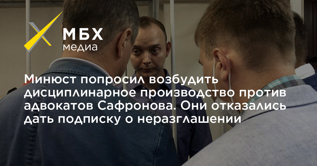 Управление министерства юстиции России по Москве обратилось в Адвокатскую палату города с просьбой возбудить дисциплинарное производство в отношении четырех адвокатов обвиняемого в государственной измене журналиста Ивана Сафронова. Ранее они отказались дать подписку о неразглашении данных следствия. Об этом сообщает «Интерфакс» со ссылкой на руководителя правозащитного объединения «Команда 29» Ивана Павлова.