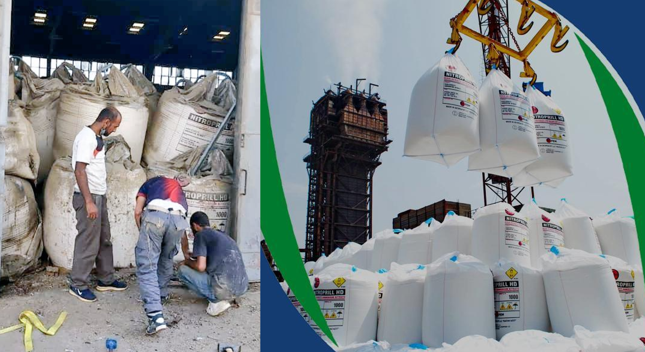 Слева — фото из ливанских соцсетей, на котором запечатлены мешки с маркировкой Nitroprill HD на складе в порту Бейрута. Справа — фрагмент изображения с официального сайта «Рустави Азот»