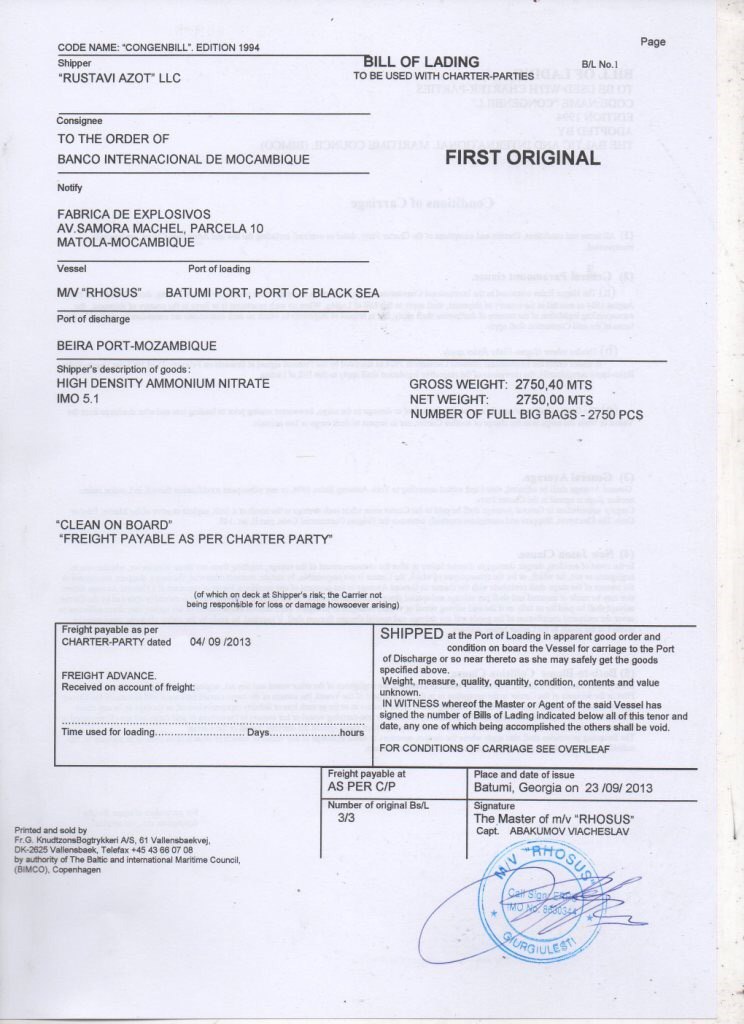В документе, подписанном в грузинском Батуми 23 сентября 2013 года тогдашним капитаном Rhosus Вячеславом Абакумовым, в качестве поставщика указано акционерное общество «Рустави Азот», в качестве получателя — международный банк Мозамбика. При этом в разделе «Уведомить о прибытии» вместе с адресом указано предприятие Fabrica de Explosivos — это распространенная практика для указания стороны, которая занимается таможенным оформлением и дальше распоряжается грузом.