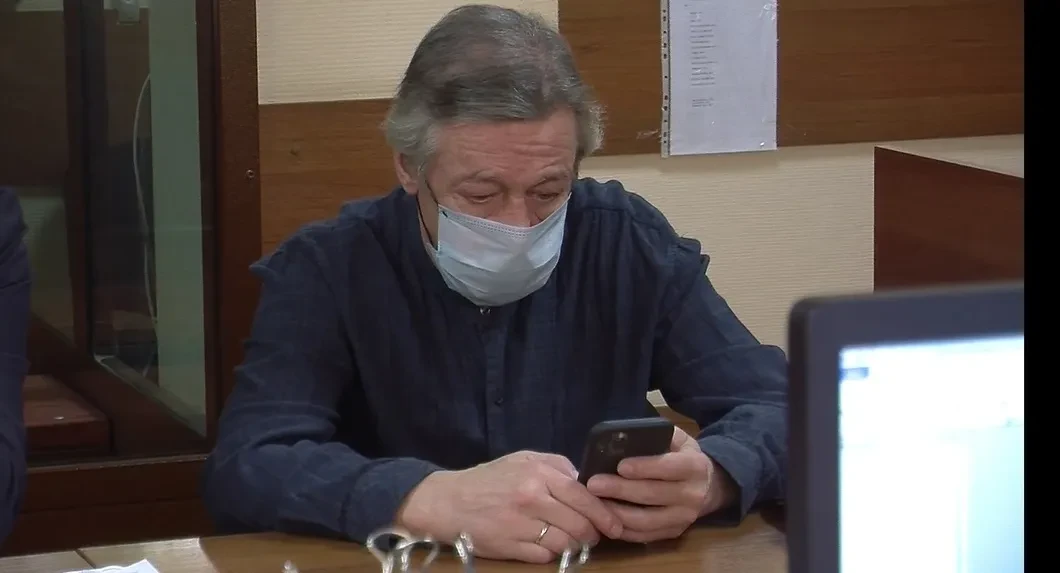 Ефремов, сгорбившись, утыкается в мобильник — и камера заглядывает ему через плечо, прямо в телефон. Мобильник формально запрещен и сразу вызывает бурю агрессивных комментариев. Но оказывается, это телефон адвоката.