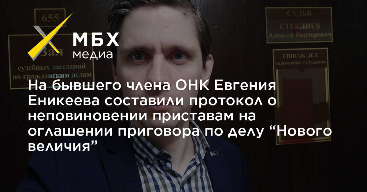 На бывшего члена ОНК Евгения Еникеева составили протокол о неповиновении приставам (часть 2 статьи 17.3 КоАП) на оглашении приговора по делу «Нового величия». Об этом он рассказал «МБХ медиа».