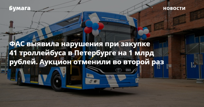 ФАС предписала Горэлектротрансу провести закупку с исправлением ошибок в документации. Как пишет «Фонтанка», Горэлектротранс не стал запускать процедуру снова и отказался от аукциона, объяснив это изменениями из-за переноса транспортной реформы.