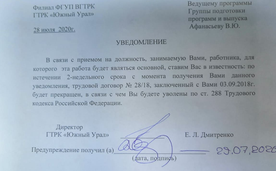 Ведущий ГТРК "Южный Урал" Вячеслав Афанасьев, работавший в эфире под псевдонимом Вячеслав Холмс, был уволен после того, как дал интервью Радио Свобода, а также провел стримы с акций "Открытой России" на своем личном канале в YouTube. Официальная причина расторжения трудового договора – приход нового сотрудника.