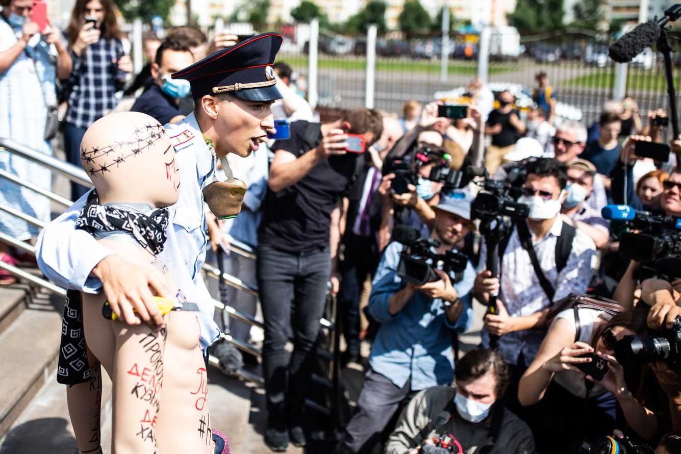 “I know that an illegal act is being carried out in this court. We all know that the court demands only blood,” shouts activist Pavel Kristevich from the steps of Moscow’s Lublinsky District Court. Kristevich, dressed in a police uniform, has a mannequin propped up against his left shoulder. The mannequin’s body is covered in the names of political prisoners and high-profile Russian court cases. Among those listed are the “Network” (“Set”) terrorism case and “The Moscow Case,” as well as the names of LGBTQ activist Yulia Tsvetkova, journalist Svetlana Prokopyeva, the Khachaturyan sisters, and members of Pussy Riot. The mannequin’s stomach has a call for freedom and humanity for the suspects in the “Novoe Velichie” case.