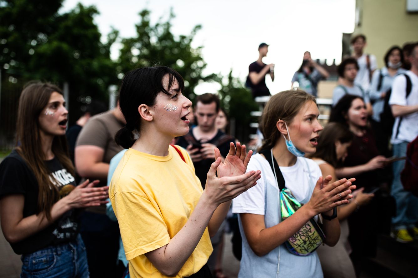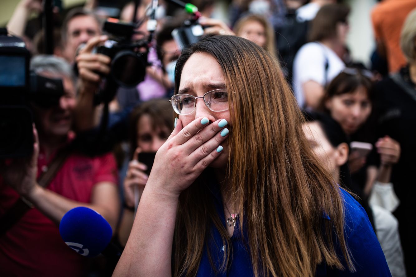 The crowd applauds the defendants’ lawyers and chants “Thank you.” But those who only received probation don’t look happy. Dubovik continues crying — several women try to console her. One of them holds a cigarette in her hand, repeating, “Smoke drink, do whatever you want, I feel like hell!”