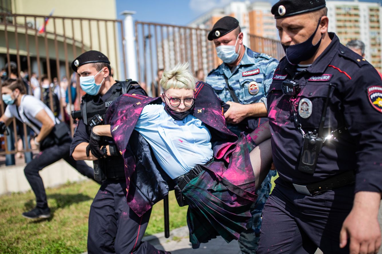 Law enforcement officers also arrest two girls dressed in police uniforms, who were spraying pink paint in front of the courthouse; as well as an elderly man who was conducting a solo demonstration in support of the accused.