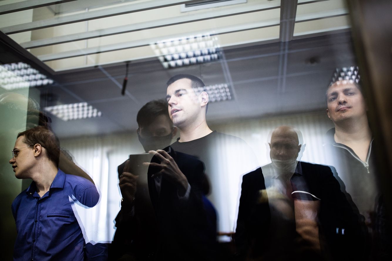 Evgeny Feldman for “Meduza” Vyacheslav Kryukov, Ruslan Kostylenkov, and Pyotr Karamzin during the sentencing.