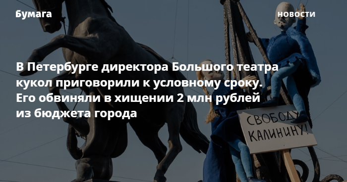 Директора БТК Александра Калинина задержали в апреле 2019 года. Сначала его обвинили в получении взятки в 1,2 миллиона рублей, но позже дело переквалифицировали на мошенничество. Большой театр кукол проводил акции в поддержку Калинина. «Бумага» рассказывала о деле против Калинина.