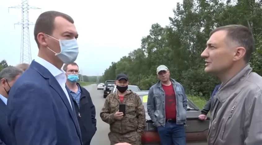 — Вы почему прячетесь от людей? — задает вопрос Дегтяреву один из остановивших его местных жителей на трассе на Ванино. — Вы прячетесь от людей, которые в Хабаровске вчера вас ждали. Они хотели, чтобы вы ответили на их вопросы, насущные, больные, о том, что нужна помощь Фургалу. Нашему любимому. Я за него голосовал, я — житель Хабаровского края, Ванино. Я болею за него, а вы не болеете.