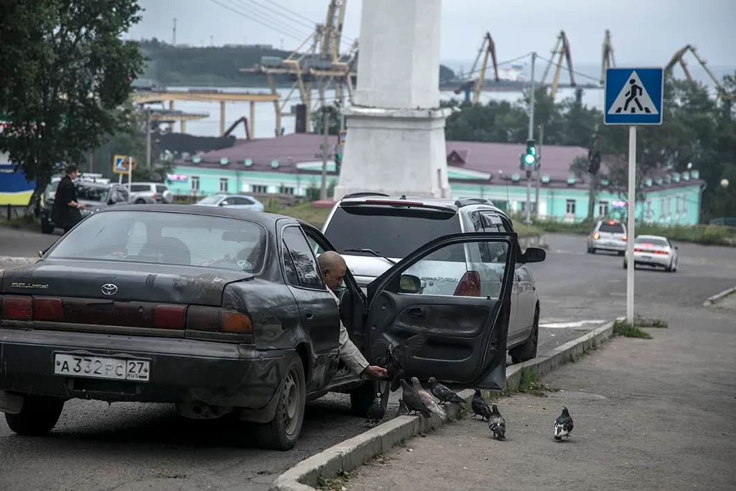 Он сидит в брючном костюме в приоткрытой машине на одной из центральных улиц Ванино и кормит столпившихся рядом голубей из рук семечками.