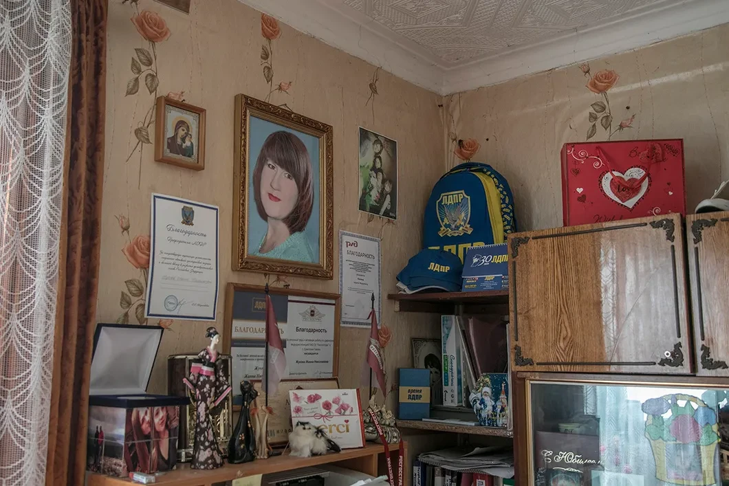 У Жанны, многодетной мамы и активистки местного отделения ЛДПР, свой небольшой домик с огромным огородом и теплицей в поселке Заветы Ильича — это в десяти минутах от Ванино на машине. Рядом с домом в клетках топчутся куры с петухом, за забором бродят коровы, а рядом с будкой на солнце нежится пушистый черный пес. В углу комнаты у нее словно иконостас из грамот, фотографий и символики ЛДПР — кепки, рюкзака и календарика.
