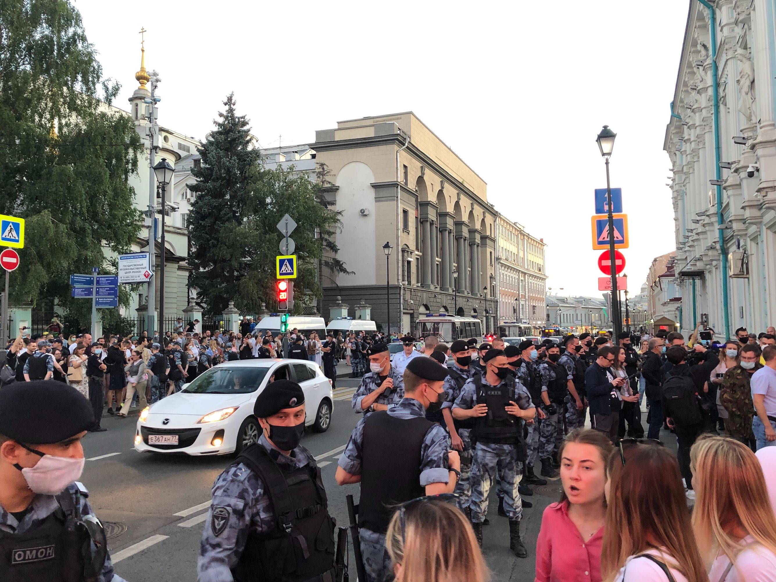 - Самые активные протесты пока что в Москве около посольства Беларуси. Там около двух тысяч человек остались митинговать после того, как не успели проголосовать. ОМОН пока их не разгоняет.